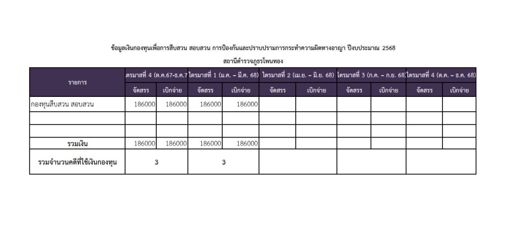 O13 ข้อมูลเงินกองทุนเพื่อการสืบสวน สอบสวน การป้องกันและปราบปราม การกระทำความผิดทางอาญา โดย / ไม่มีหมวดหมู่ ดาวน์โหลดในรูปแบบ PDF ดาวน์โหลดในรูปแบบ Excel